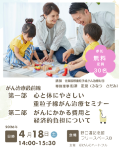 九州初の重粒子線治療施設「サガハイマット」の専務理事を講師にお迎えします。 体への負担が少ない最新治療から、避けては通れない費用の話まで、専門家が分かりやすく解説!
